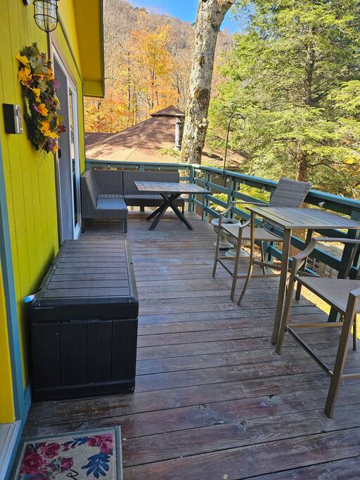 Gorgeously renovated! Stone gas fire place. New stainless steel appliances. New gas fireplace. Walk in shower. Long deck with comfortable outdoor furniture. Big Jacuzzi tub in master on suite. Open kitchen and living room looks out on large deck for privacy. Park 3 cars on flat parking area. 1 free bottle of wine * please note that this cabin is private with wooded views only, and across the street from Beech Mountain Club , convenient for concerts, brewery, mountain biking and skiing.