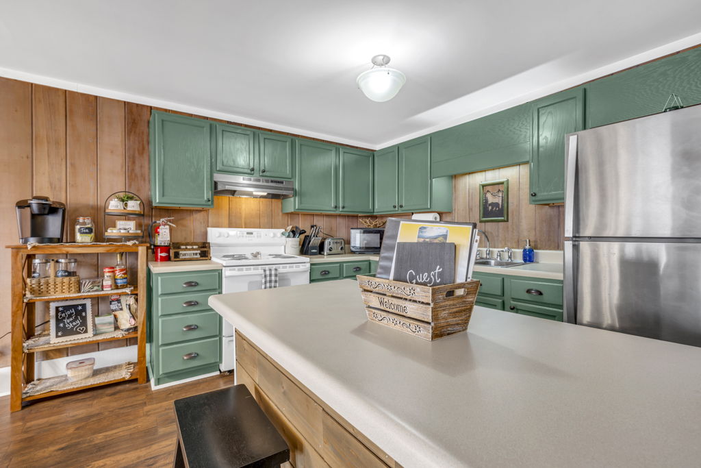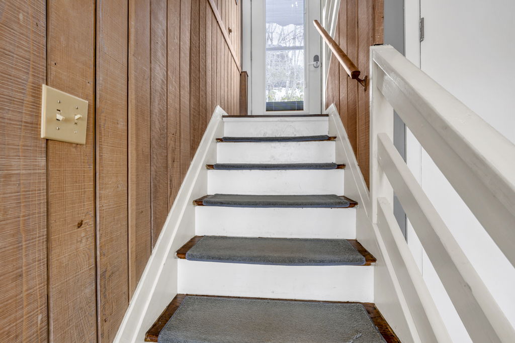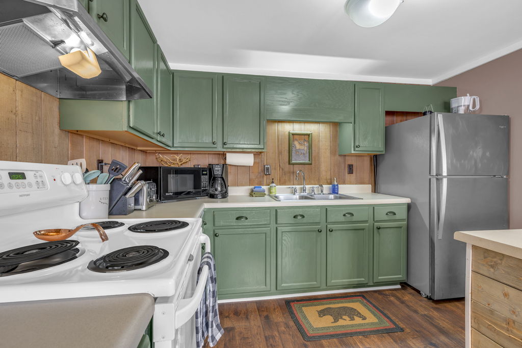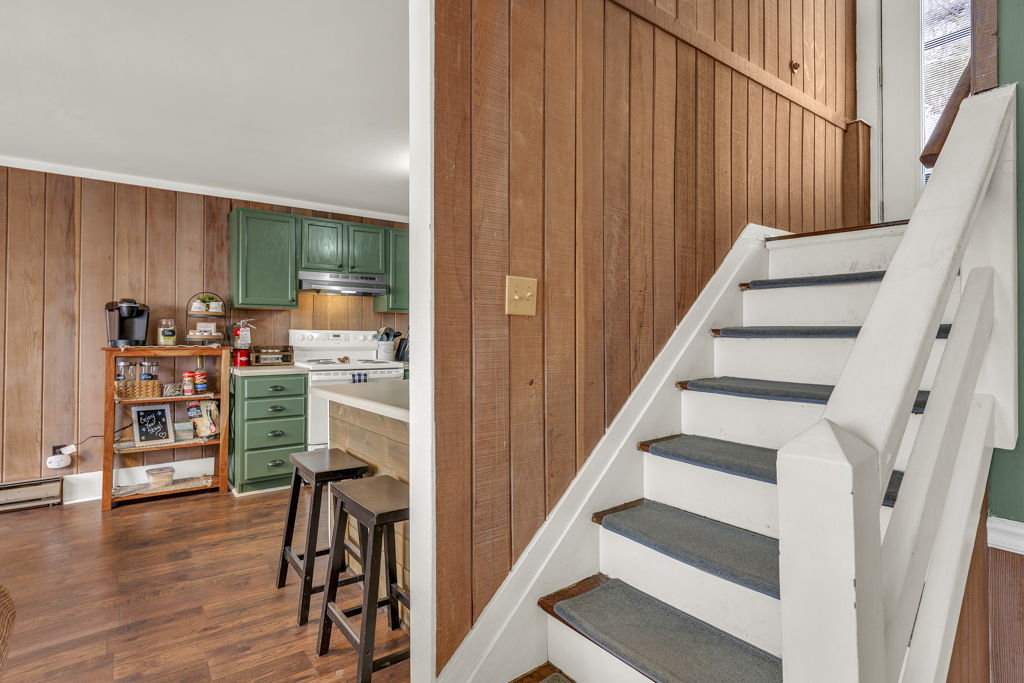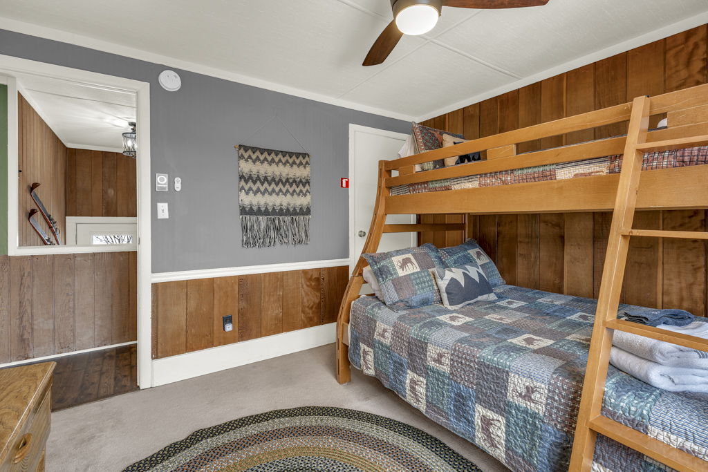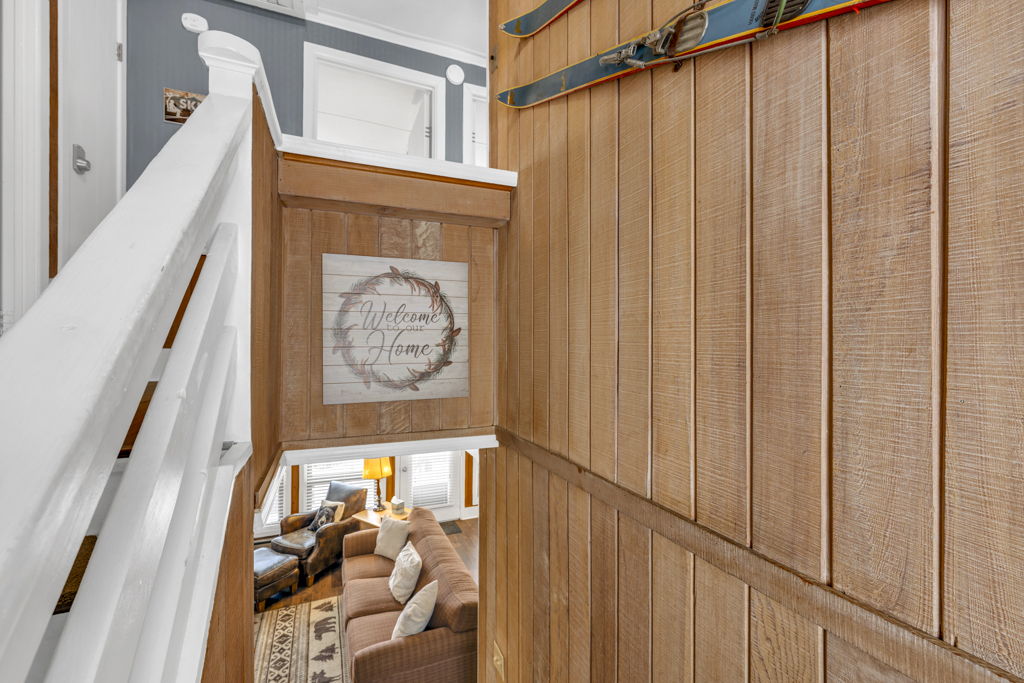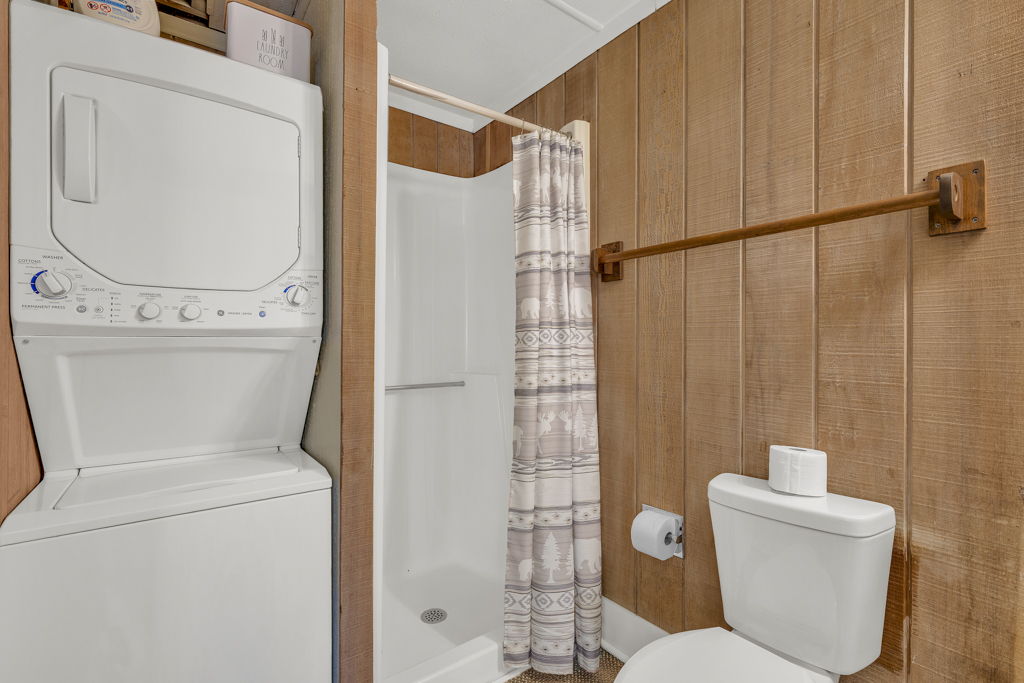 Condo with 2 floors - 6 steps up or down to each level. All bedrooms are upstairs and share a bathroom. 3 bedrooms: 2 with queen beds and 1 room with full over single bunk bed. Family room open concept with kitchen and dining room. This floor also has a bathroom with walk-in shower, plus a stacked washer and dryer.